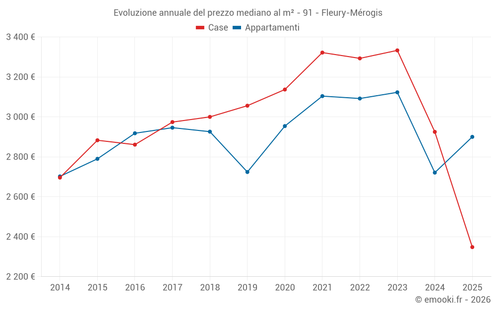 Il prezzo mediano sulle 22 transazioni di case degli ultimi 24 mesi nel comune di Fleury-Mérogis era di 3 008 € al metro quadrato per un valore patrimoniale mediano di 274 888 €. In questo periodo il 60% delle transazioni era tra 2 590 e 3 298 € al metro quadrato (dal 2° all'8° decile).