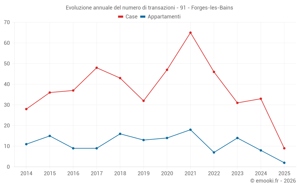 Il prezzo mediano sulle 33 transazioni di case degli ultimi 12 mesi nel comune di Forges-les-Bains era di 2 823 € al metro quadrato per un valore patrimoniale mediano di 385 200 €. In questo periodo il 60% delle transazioni era tra 2 401 e 3 898 € al metro quadrato (dal 2° all'8° decile).