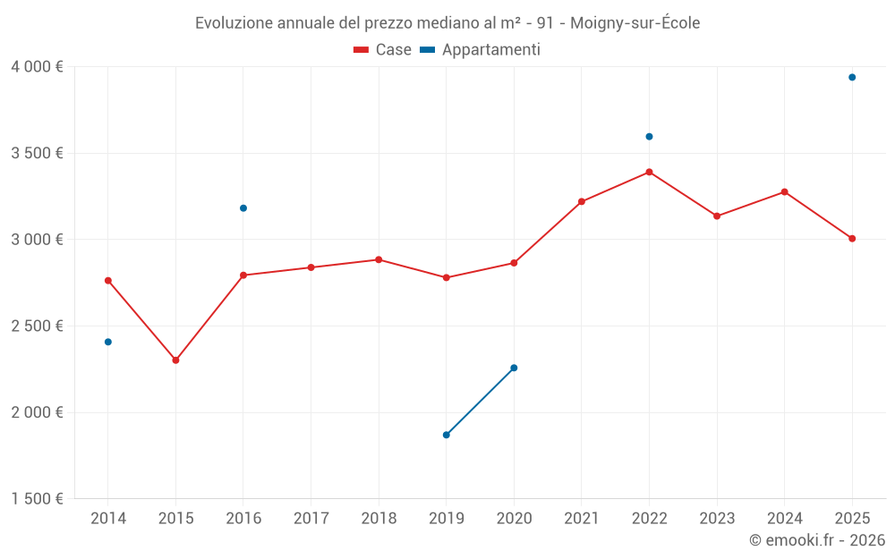 Il prezzo mediano sulle 16 transazioni di case degli ultimi 12 mesi nel comune di Moigny-sur-École era di 3 006 € al metro quadrato per un valore patrimoniale mediano di 322 450 €. In questo periodo il 60% delle transazioni era tra 2 656 e 3 913 € al metro quadrato (dal 2° all'8° decile).
