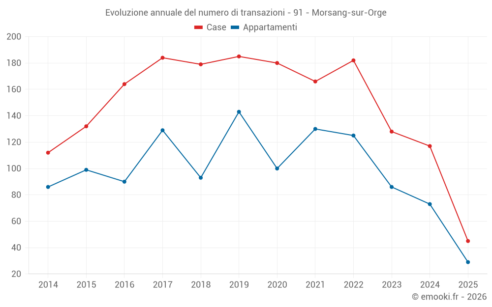 Il prezzo mediano sulle 45 transazioni di case degli ultimi 6 mesi nel comune di Morsang-sur-Orge era di 3 636 € al metro quadrato per un valore patrimoniale mediano di 320 000 €. In questo periodo il 60% delle transazioni era tra 2 943 e 5 078 € al metro quadrato (dal 2° all'8° decile).