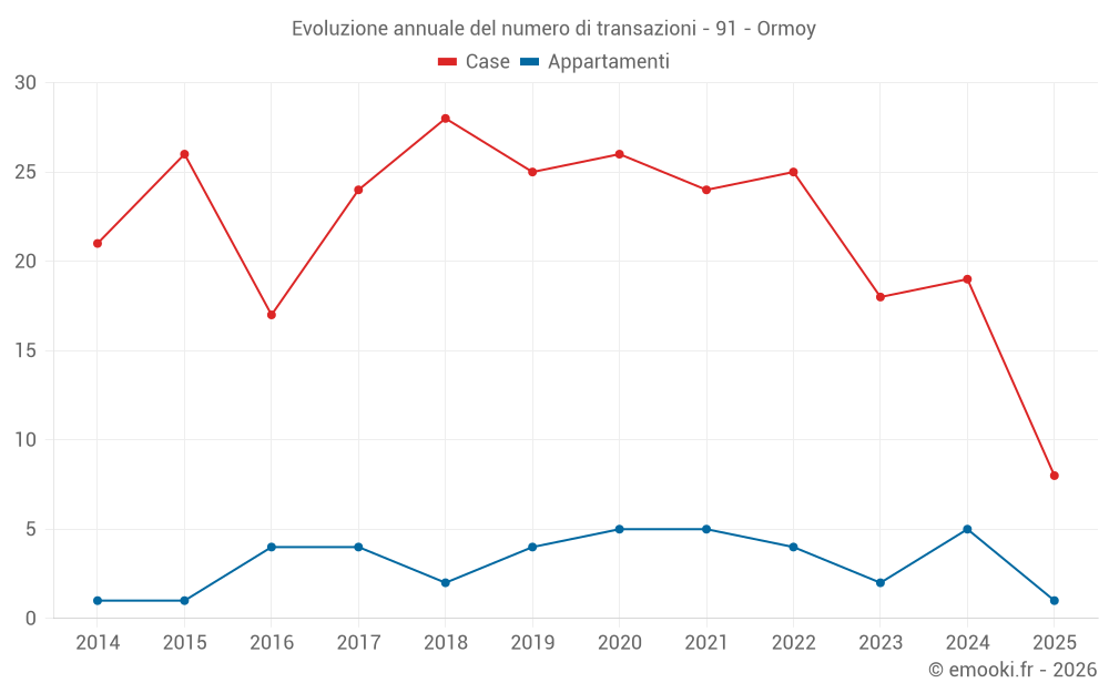 Il prezzo mediano sulle 17 transazioni di case degli ultimi 12 mesi nel comune di Ormoy era di 3 053 € al metro quadrato per un valore patrimoniale mediano di 302 280 €. In questo periodo il 60% delle transazioni era tra 2 599 e 3 364 € al metro quadrato (dal 2° all'8° decile).