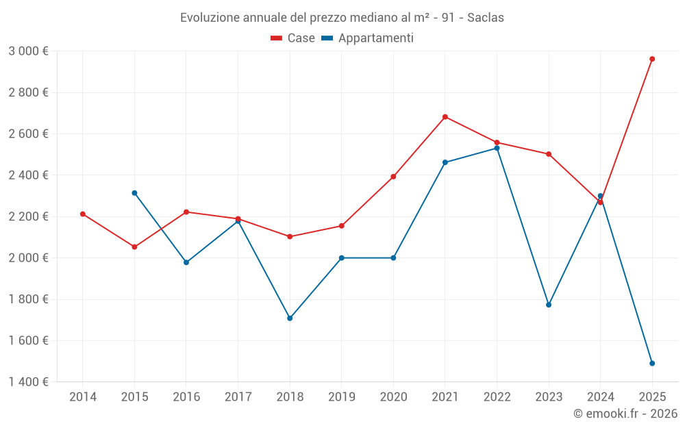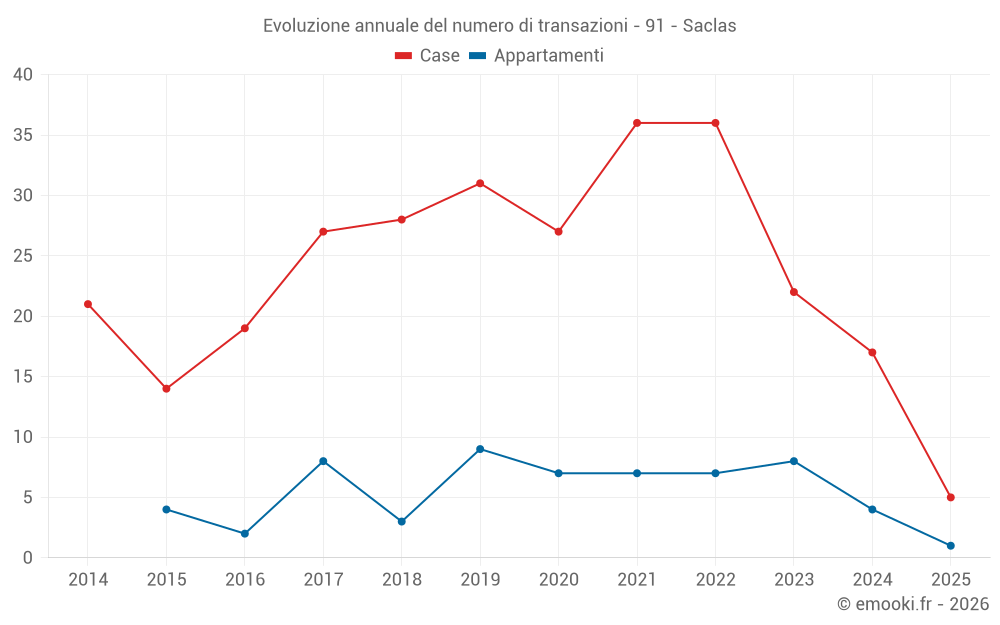 Il prezzo mediano sulle 34 transazioni di case degli ultimi 24 mesi nel comune di Saclas era di 2 428 € al metro quadrato per un valore patrimoniale mediano di 228 675 €. In questo periodo il 60% delle transazioni era tra 1 910 e 2 952 € al metro quadrato (dal 2° all'8° decile).