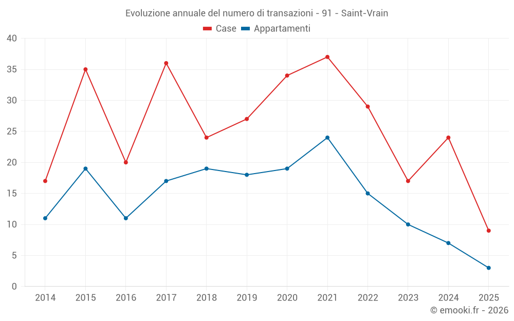 Il prezzo mediano sulle 24 transazioni di case degli ultimi 12 mesi nel comune di Saint-Vrain era di 3 191 € al metro quadrato per un valore patrimoniale mediano di 305 000 €. In questo periodo il 60% delle transazioni era tra 2 652 e 3 467 € al metro quadrato (dal 2° all'8° decile).