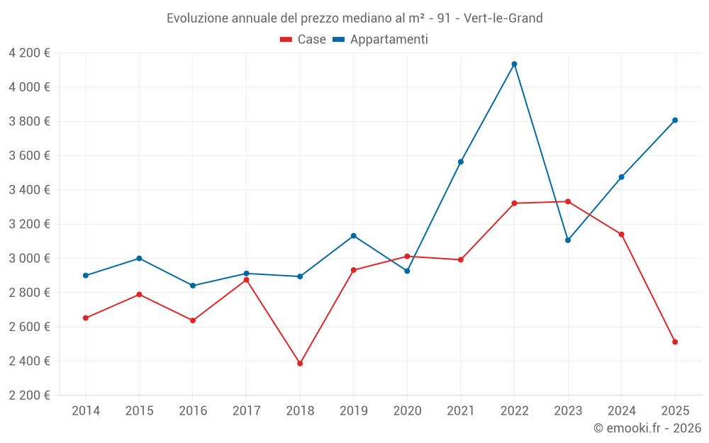 Il prezzo mediano sulle 21 transazioni di case degli ultimi 24 mesi nel comune di Vert-le-Grand era di 3 067 € al metro quadrato per un valore patrimoniale mediano di 308 000 €. In questo periodo il 60% delle transazioni era tra 2 404 e 3 649 € al metro quadrato (dal 2° all'8° decile).