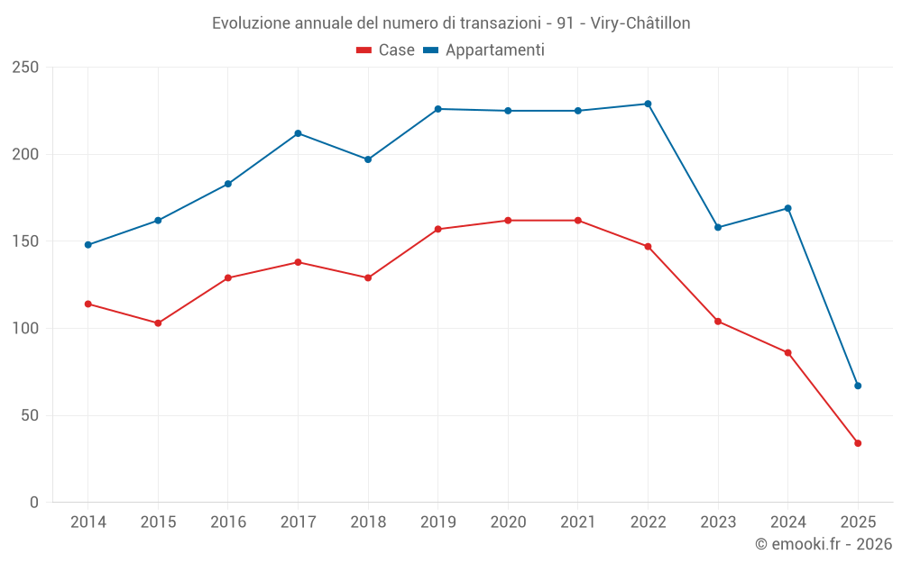 Il prezzo mediano sulle 34 transazioni di case degli ultimi 6 mesi nel comune di Viry-Châtillon era di 3 406 € al metro quadrato per un valore patrimoniale mediano di 300 000 €. In questo periodo il 60% delle transazioni era tra 2 302 e 3 997 € al metro quadrato (dal 2° all'8° decile).