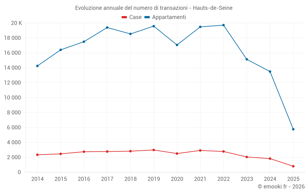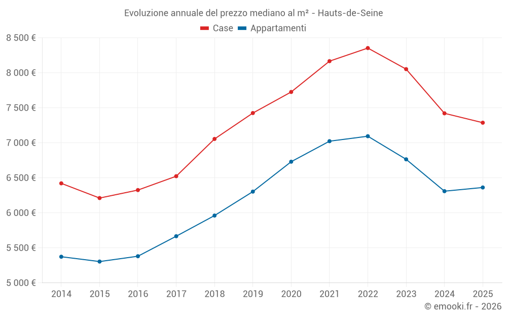 Il prezzo mediano sulle 313 transazioni di case degli ultimi 3 mesi nel dipartimento di Hauts-de-Seine era di 6 960 € al metro quadrato per un valore patrimoniale mediano di 760 000 €. In questo periodo il 60% delle transazioni era tra 5 301 e 9 154 € al metro quadrato (dal 2° all'8° decile).