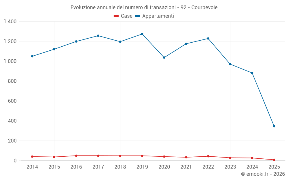 Il prezzo mediano sulle 95 transazioni di appartamenti degli ultimi 3 mesi nel comune di Courbevoie era di 6 463 € al metro quadrato per un valore patrimoniale mediano di 332 000 €. In questo periodo il 60% delle transazioni era tra 5 374 e 7 955 € al metro quadrato (dal 2° all'8° decile).