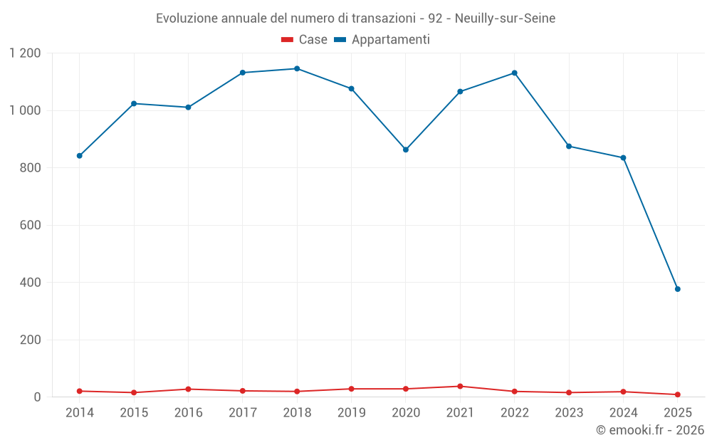 Il prezzo mediano sulle 130 transazioni di appartamenti degli ultimi 3 mesi nel comune di Neuilly-sur-Seine era di 10 322 € al metro quadrato per un valore patrimoniale mediano di 765 000 €. In questo periodo il 60% delle transazioni era tra 8 376 e 12 171 € al metro quadrato (dal 2° all'8° decile).