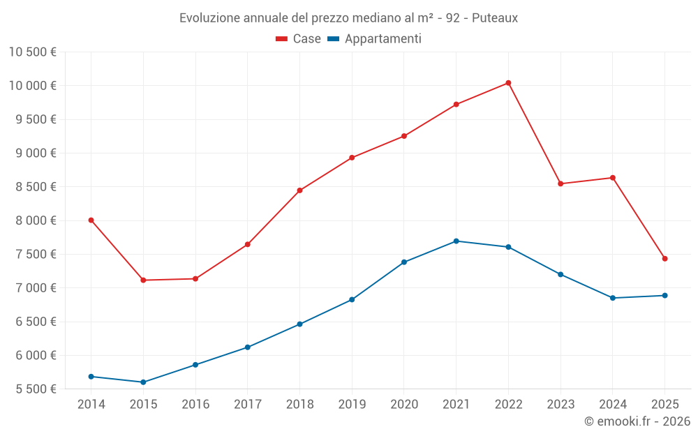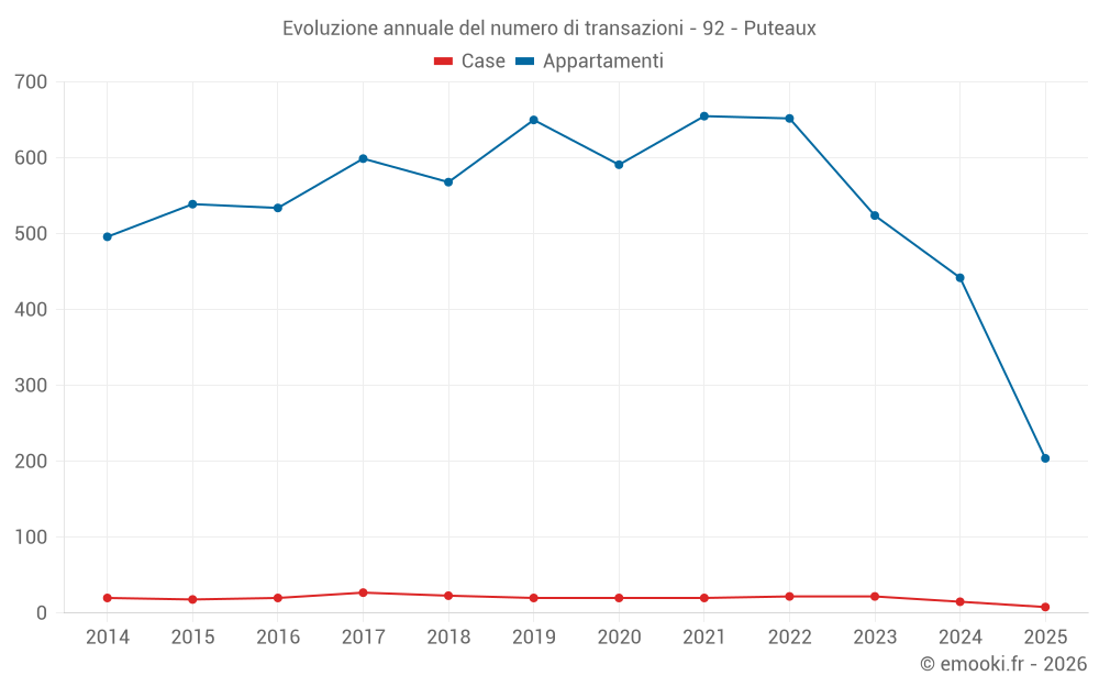 Il prezzo mediano sulle 19 transazioni di case degli ultimi 12 mesi nel comune di Puteaux era di 8 841 € al metro quadrato per un valore patrimoniale mediano di 873 900 €. In questo periodo il 60% delle transazioni era tra 6 520 e 10 644 € al metro quadrato (dal 2° all'8° decile).