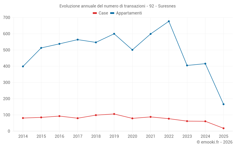 Il prezzo mediano sulle 18 transazioni di case degli ultimi 6 mesi nel comune di Suresnes era di 8 626 € al metro quadrato per un valore patrimoniale mediano di 865 000 €. In questo periodo il 60% delle transazioni era tra 7 185 e 10 010 € al metro quadrato (dal 2° all'8° decile).