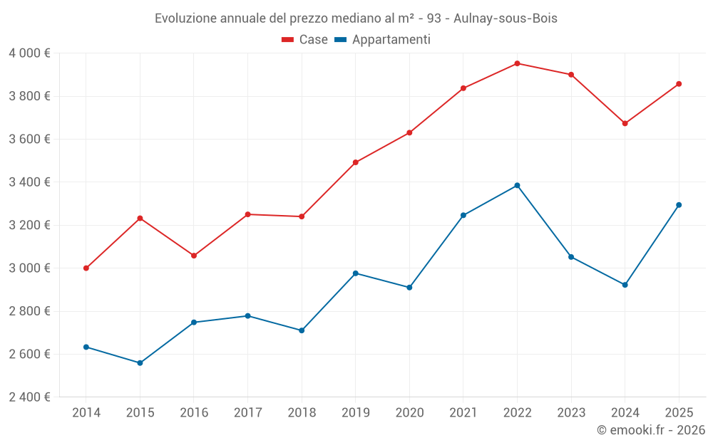 Il prezzo mediano sulle 51 transazioni di case degli ultimi 3 mesi nel comune di Aulnay-sous-Bois era di 4 000 € al metro quadrato per un valore patrimoniale mediano di 315 000 €. In questo periodo il 60% delle transazioni era tra 3 196 e 5 194 € al metro quadrato (dal 2° all'8° decile).