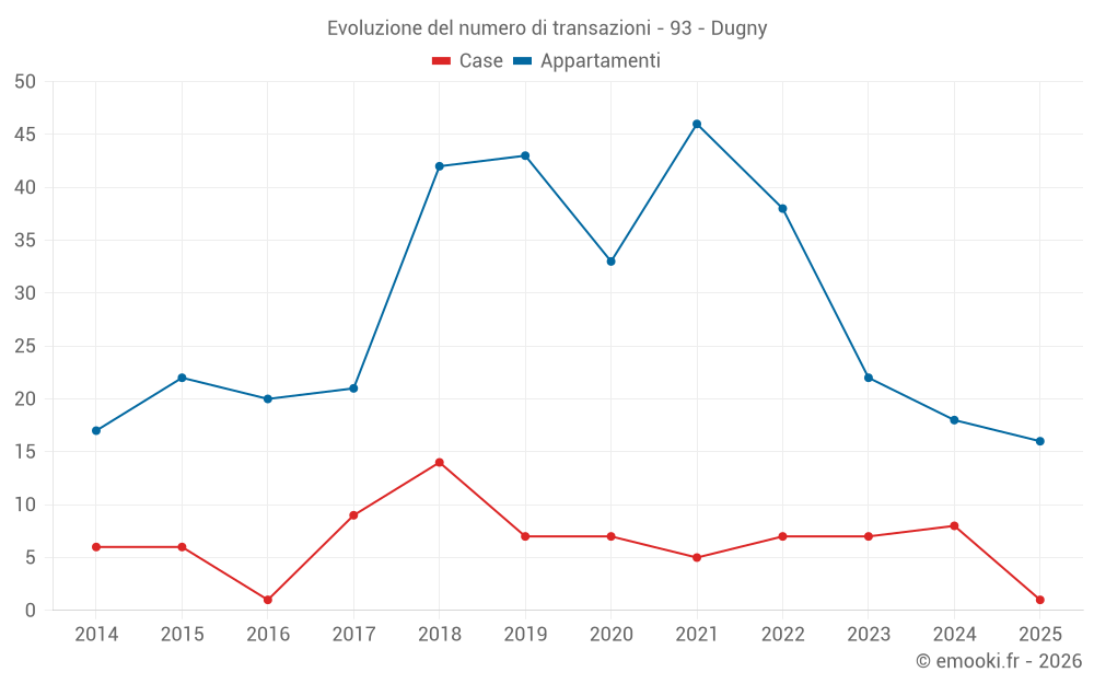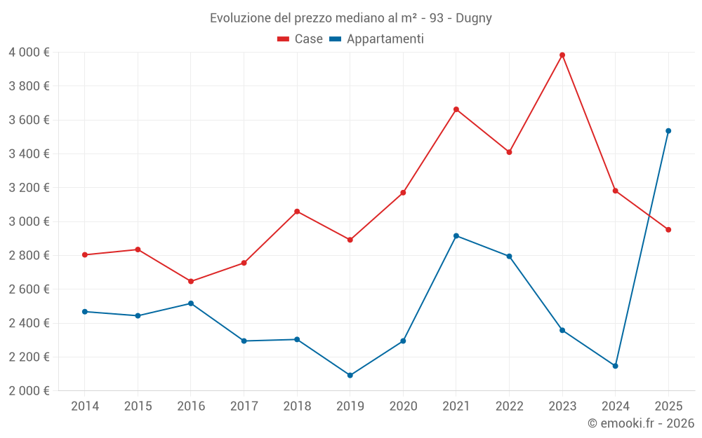 Il prezzo mediano sulle 27 transazioni di appartamenti degli ultimi 12 mesi nel comune di Dugny era di 3 091 € al metro quadrato per un valore patrimoniale mediano di 170 000 €. In questo periodo il 60% delle transazioni era tra 2 071 e 3 798 € al metro quadrato (dal 2° all'8° decile).