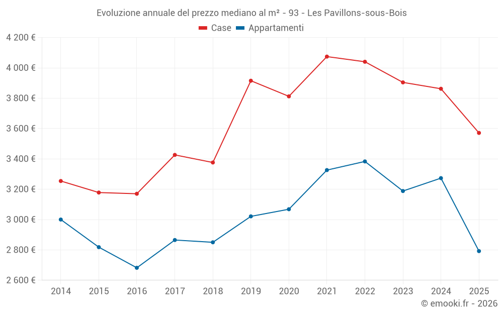 Il prezzo mediano sulle 29 transazioni di appartamenti degli ultimi 3 mesi nel comune di Les Pavillons-sous-Bois era di 2 878 € al metro quadrato per un valore patrimoniale mediano di 135 500 €. In questo periodo il 60% delle transazioni era tra 2 440 e 3 470 € al metro quadrato (dal 2° all'8° decile).