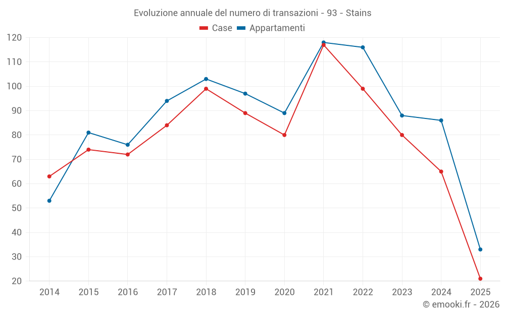 Il prezzo mediano sulle 33 transazioni di appartamenti degli ultimi 6 mesi nel comune di Stains era di 2 925 € al metro quadrato per un valore patrimoniale mediano di 145 000 €. In questo periodo il 60% delle transazioni era tra 2 308 e 3 525 € al metro quadrato (dal 2° all'8° decile).