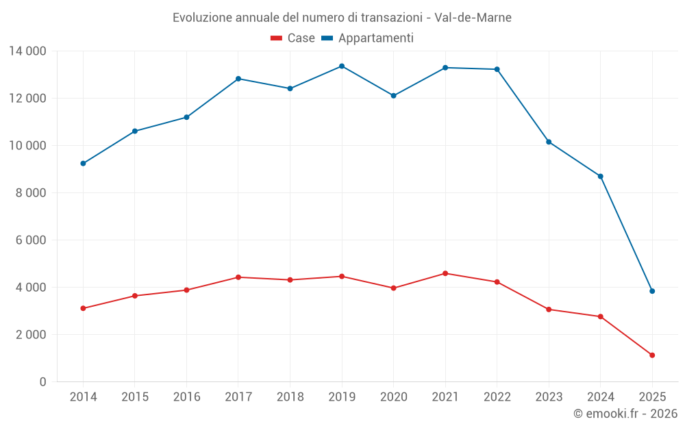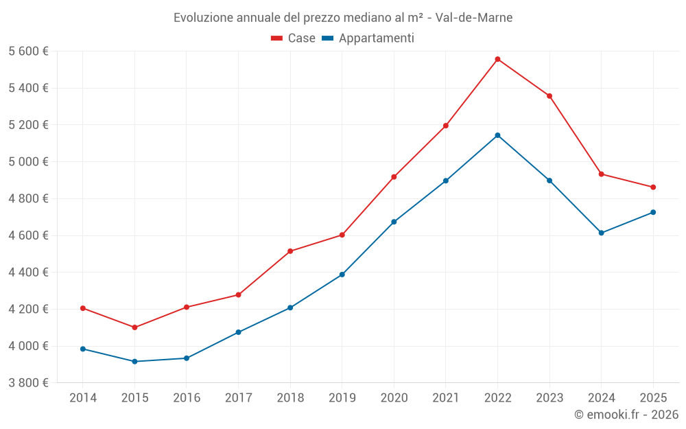 Il prezzo mediano sulle 444 transazioni di case degli ultimi 3 mesi nel dipartimento di Val-de-Marne era di 4 996 € al metro quadrato per un valore patrimoniale mediano di 433 150 €. In questo periodo il 60% delle transazioni era tra 3 418 e 7 042 € al metro quadrato (dal 2° all'8° decile).
