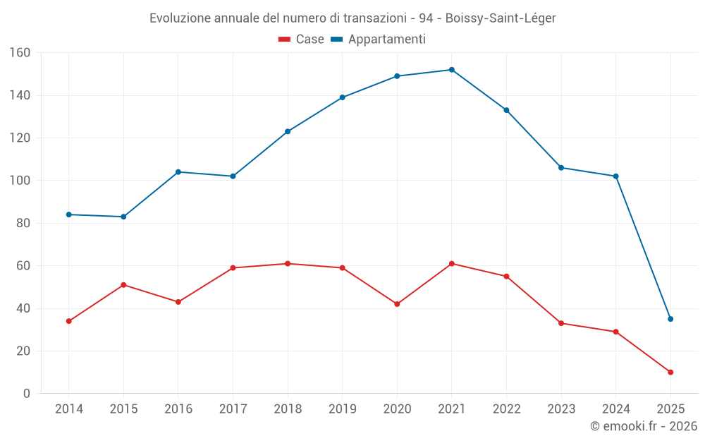 Il prezzo mediano sulle 35 transazioni di appartamenti degli ultimi 6 mesi nel comune di Boissy-Saint-Léger era di 3 342 € al metro quadrato per un valore patrimoniale mediano di 175 000 €. In questo periodo il 60% delle transazioni era tra 2 373 e 4 198 € al metro quadrato (dal 2° all'8° decile).