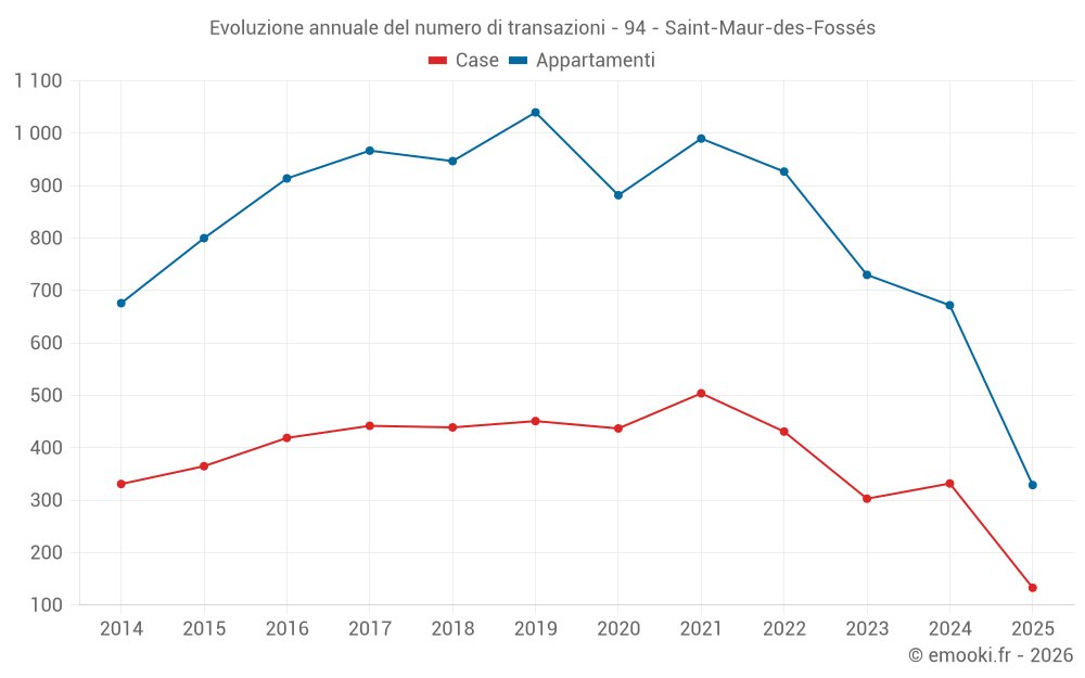 Il prezzo mediano sulle 118 transazioni di appartamenti degli ultimi 3 mesi nel comune di Saint-Maur-des-Fossés era di 5 348 € al metro quadrato per un valore patrimoniale mediano di 289 500 €. In questo periodo il 60% delle transazioni era tra 4 398 e 6 294 € al metro quadrato (dal 2° all'8° decile).