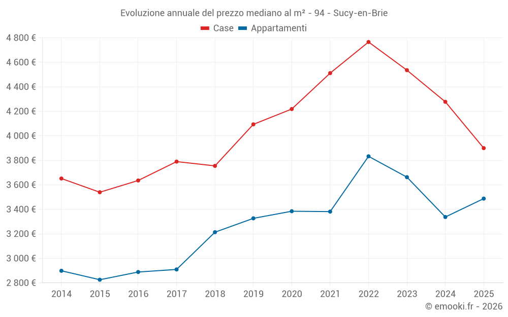 Il prezzo mediano sulle 43 transazioni di case degli ultimi 6 mesi nel comune di Sucy-en-Brie era di 3 900 € al metro quadrato per un valore patrimoniale mediano di 405 000 €. In questo periodo il 60% delle transazioni era tra 3 072 e 4 540 € al metro quadrato (dal 2° all'8° decile).