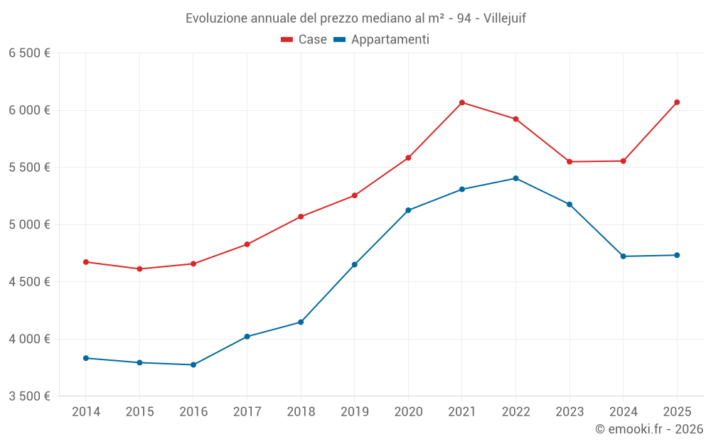 Il prezzo mediano sulle 32 transazioni di case degli ultimi 6 mesi nel comune di Villejuif era di 6 070 € al metro quadrato per un valore patrimoniale mediano di 497 400 €. In questo periodo il 60% delle transazioni era tra 5 139 e 6 680 € al metro quadrato (dal 2° all'8° decile).