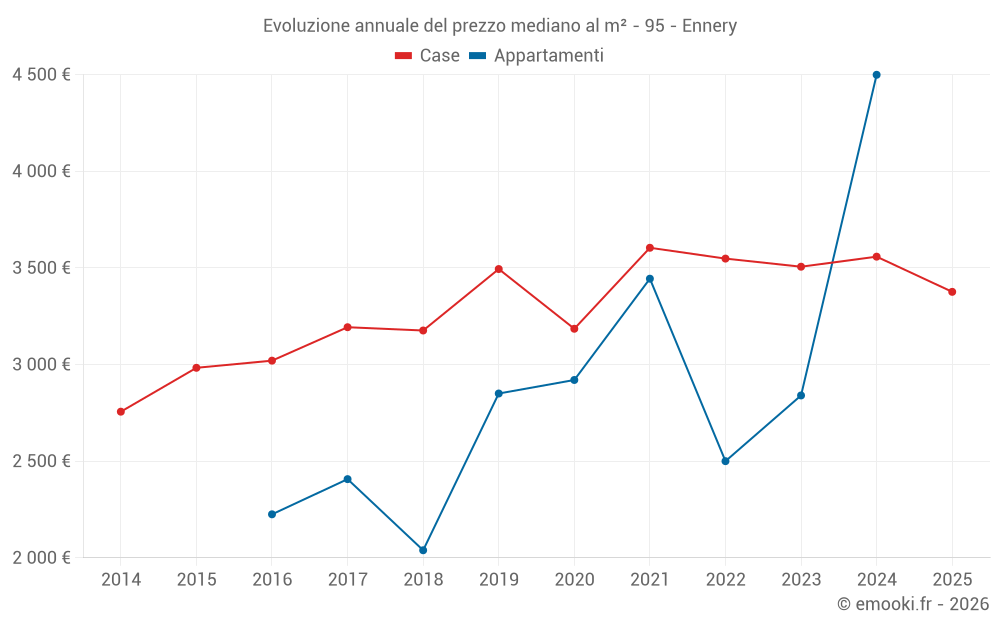 Il prezzo mediano sulle 23 transazioni di case degli ultimi 12 mesi nel comune di Ennery era di 3 440 € al metro quadrato per un valore patrimoniale mediano di 377 500 €. In questo periodo il 60% delle transazioni era tra 2 791 e 3 950 € al metro quadrato (dal 2° all'8° decile).