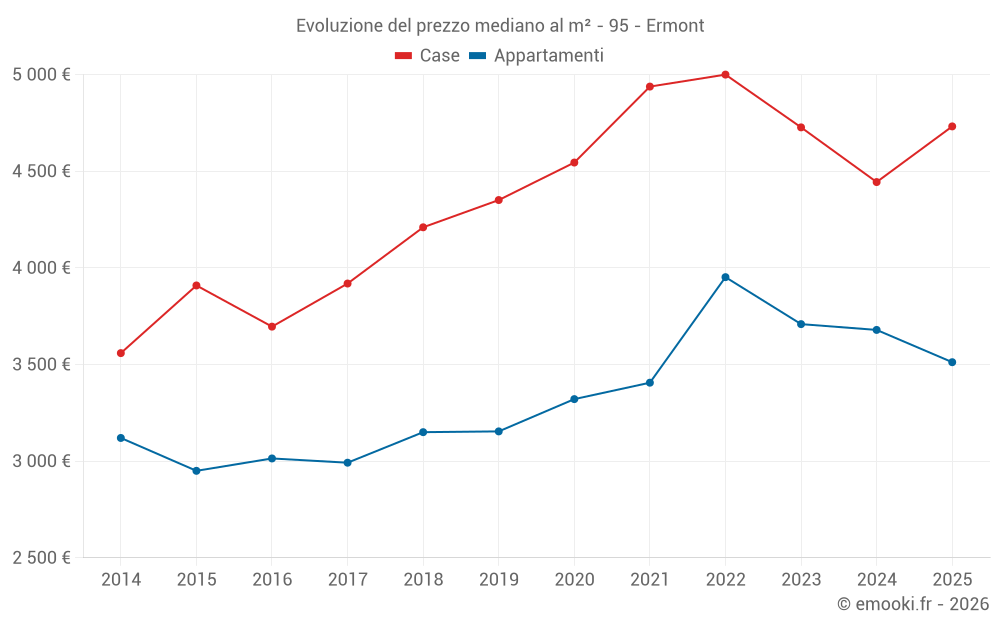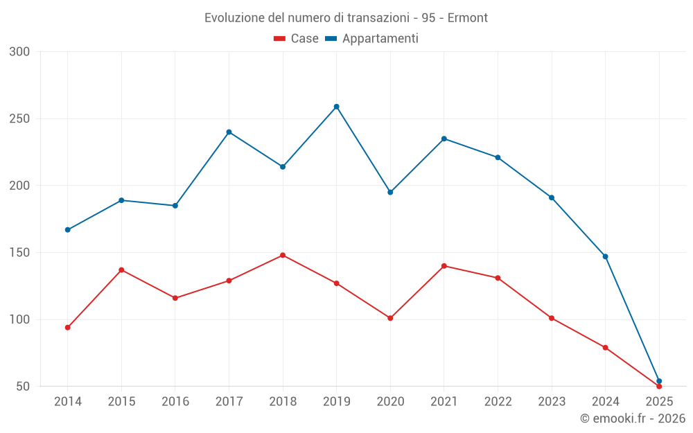 Il prezzo mediano sulle 20 transazioni di appartamenti degli ultimi 3 mesi nel comune di Ermont era di 3 796 € al metro quadrato per un valore patrimoniale mediano di 195 000 €. In questo periodo il 60% delle transazioni era tra 3 120 e 4 673 € al metro quadrato (dal 2° all'8° decile).