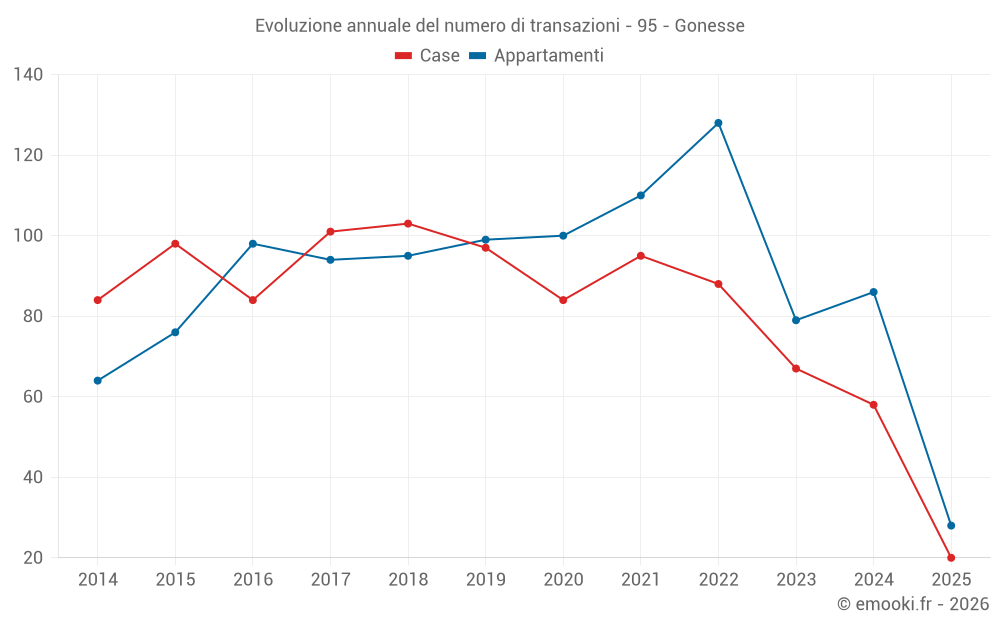 Il prezzo mediano sulle 20 transazioni di case degli ultimi 6 mesi nel comune di Gonesse era di 3 268 € al metro quadrato per un valore patrimoniale mediano di 280 000 €. In questo periodo il 60% delle transazioni era tra 2 623 e 3 714 € al metro quadrato (dal 2° all'8° decile).