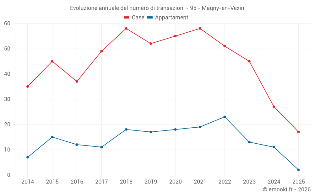 Il prezzo mediano sulle 19 transazioni di appartamenti degli ultimi 24 mesi nel comune di Magny-en-Vexin era di 2 829 € al metro quadrato per un valore patrimoniale mediano di 110 000 €. In questo periodo il 60% delle transazioni era tra 2 265 e 3 287 € al metro quadrato (dal 2° all'8° decile).