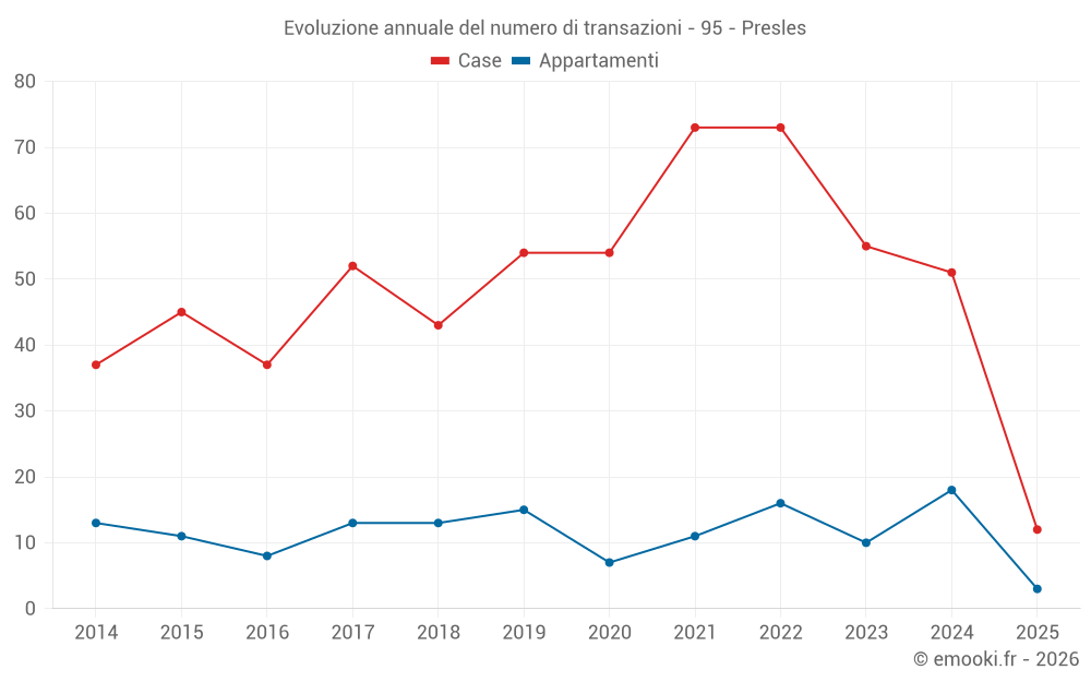 Il prezzo mediano sulle 42 transazioni di case degli ultimi 12 mesi nel comune di Presles era di 3 162 € al metro quadrato per un valore patrimoniale mediano di 292 500 €. In questo periodo il 60% delle transazioni era tra 2 518 e 4 167 € al metro quadrato (dal 2° all'8° decile).