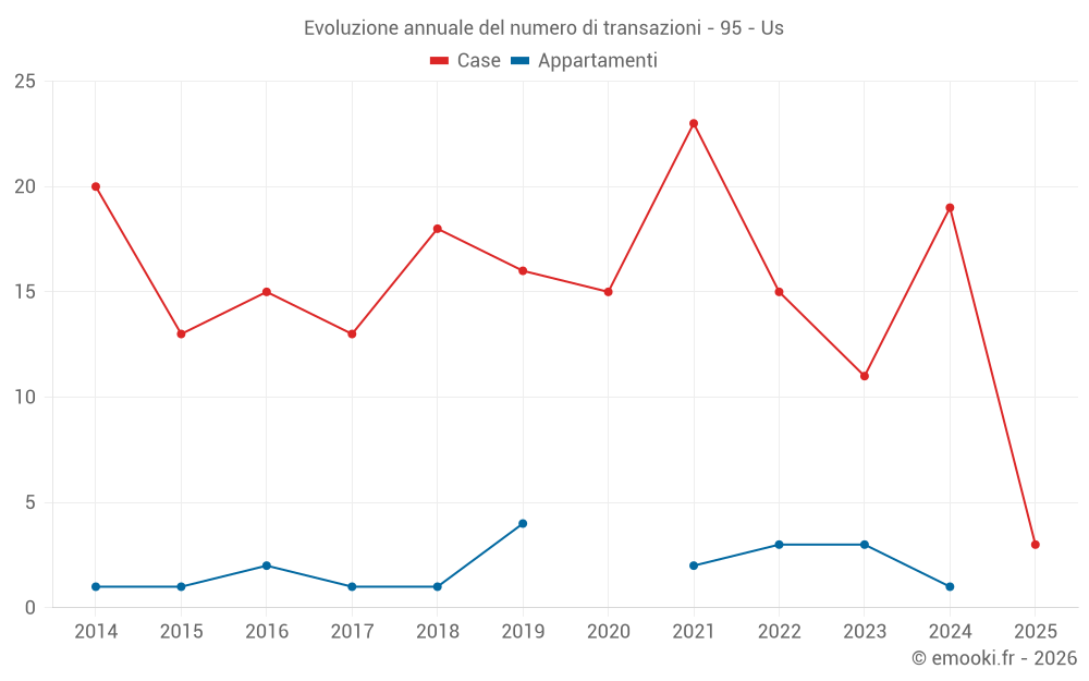 Il prezzo mediano sulle 25 transazioni di case degli ultimi 24 mesi nel comune di Us era di 3 008 € al metro quadrato per un valore patrimoniale mediano di 252 000 €. In questo periodo il 60% delle transazioni era tra 2 515 e 3 527 € al metro quadrato (dal 2° all'8° decile).
