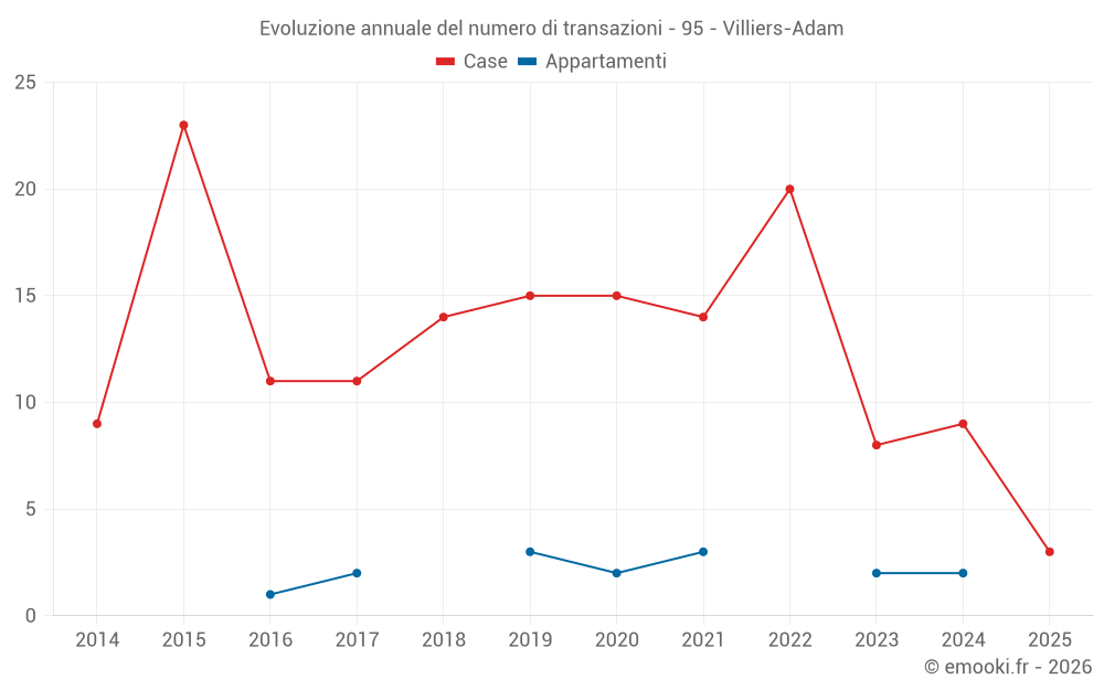 Il prezzo mediano sulle 15 transazioni di case degli ultimi 24 mesi nel comune di Villiers-Adam era di 3 840 € al metro quadrato per un valore patrimoniale mediano di 412 800 €. In questo periodo il 60% delle transazioni era tra 2 934 e 4 546 € al metro quadrato (dal 2° all'8° decile).